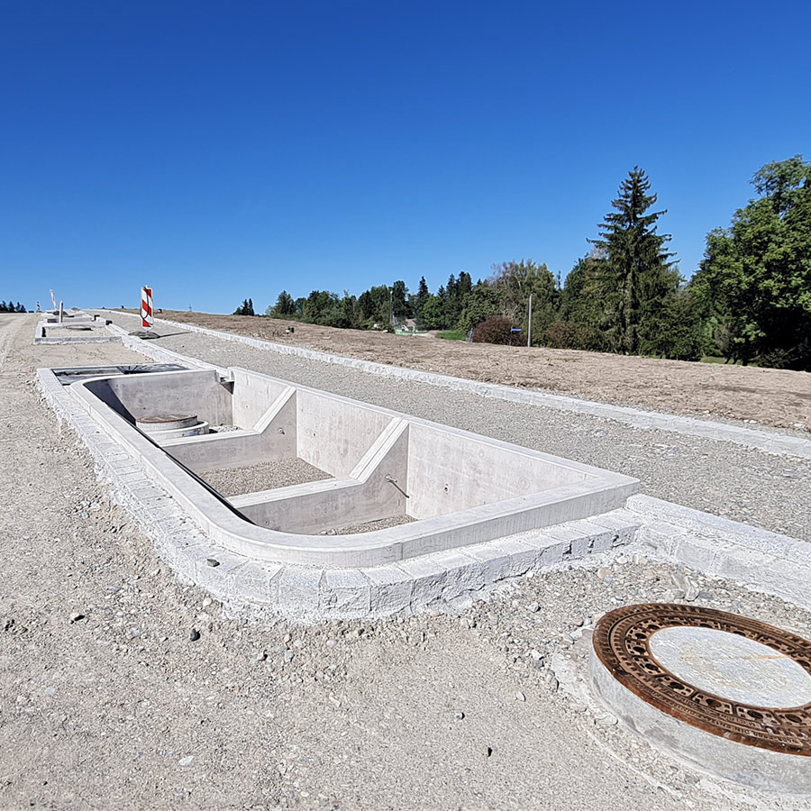 Die weitere Herausforderung bestand darin, die durch den hohen Versiegelungsgrad im Baugebiet verursachten, wesentlich höheren Regenwasserabflüsse umweltverträglich zu bewirtschaften. Eine Versickerung vor Ort ist aufgrund der Untergrundbeschaffenheit nicht möglich. Die Lösung brachten sogenannte Tiefbeete mit darunter liegenden Rigolen zur Rückhaltung und verzögerter bzw. gedrosselter Weiterleitung der Regenwassermengen nach dem "Schwammstadt-Prinzip". Die Tiefbeete werden nach Abschluss der Bautätigkeiten begrünt. Neben einem wesentlich geringeren Regenwasserabfluss führt das in den Tiefbeeten gespeicherte Wasser zur Erhöhung der Verdunstung und verbessert damit die Lebensbedingungen für Pflanzen, Tiere und Menschen im Baugebiet.
